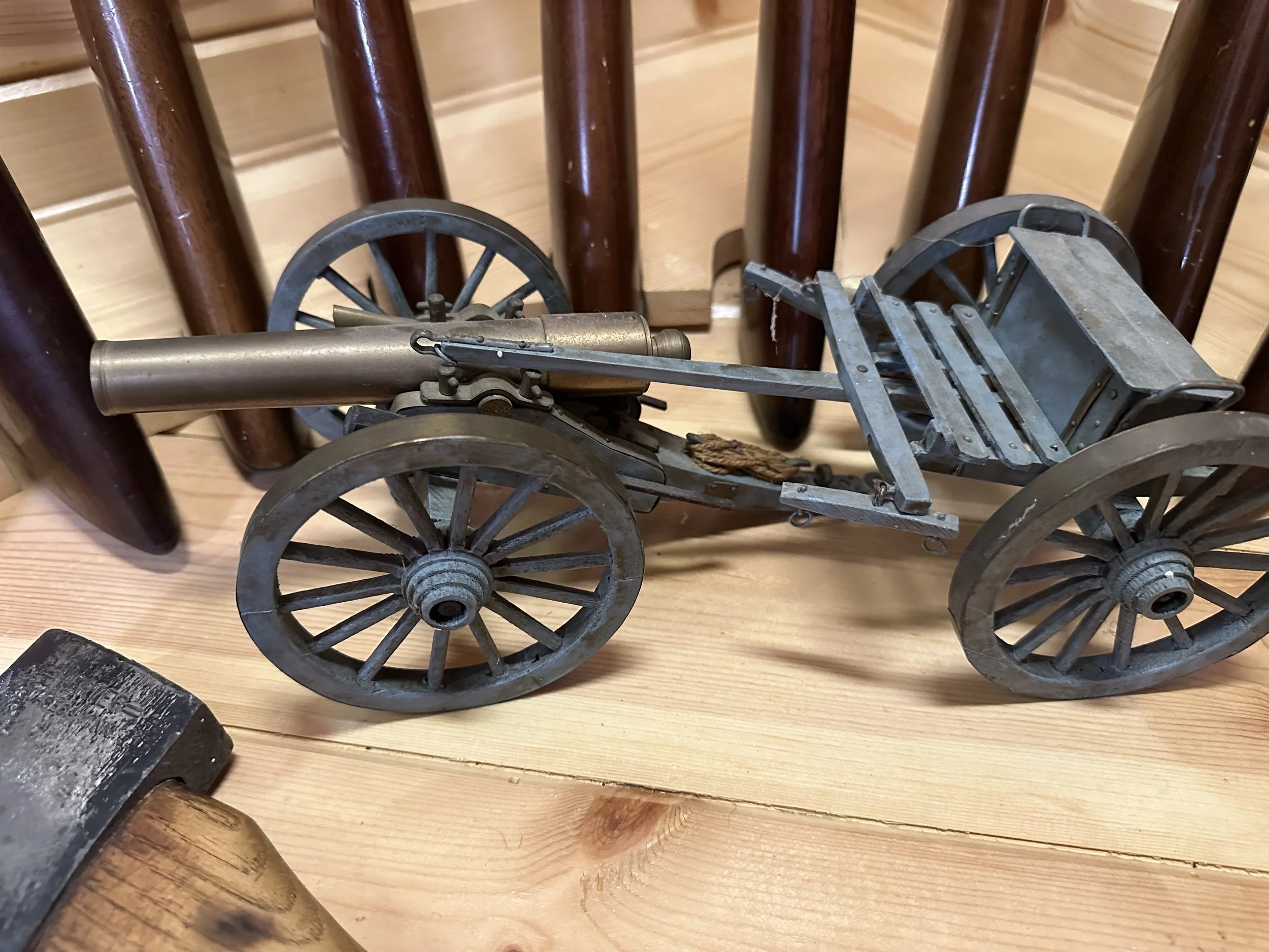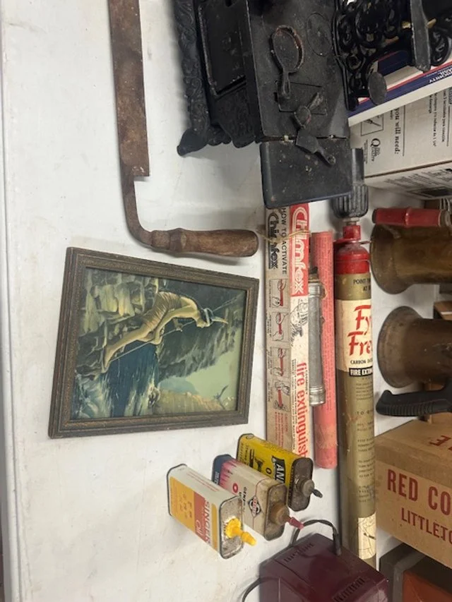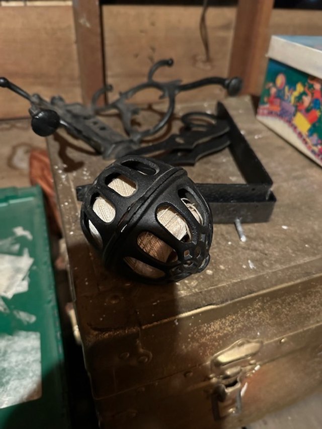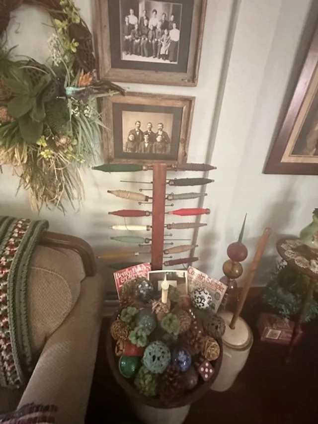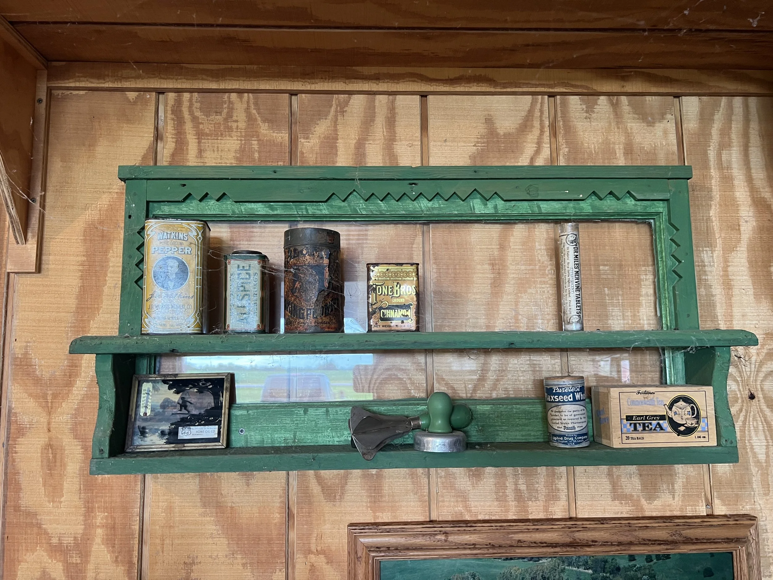 Lots of vintage Christmas items; paper-mâché rabbits; Dexter Dog; salesman sample furniture; green Aladdin lamp; cast-iron skillets; Wagner salesman-sample waffle maker; collection of vintage pin cushions; sleigh bells; Bentonsport pottery bowl; collection of Kellogg items; Iowa State College items; Vaseline glass; lightning rods (some with balls); antique picture-frame nails.