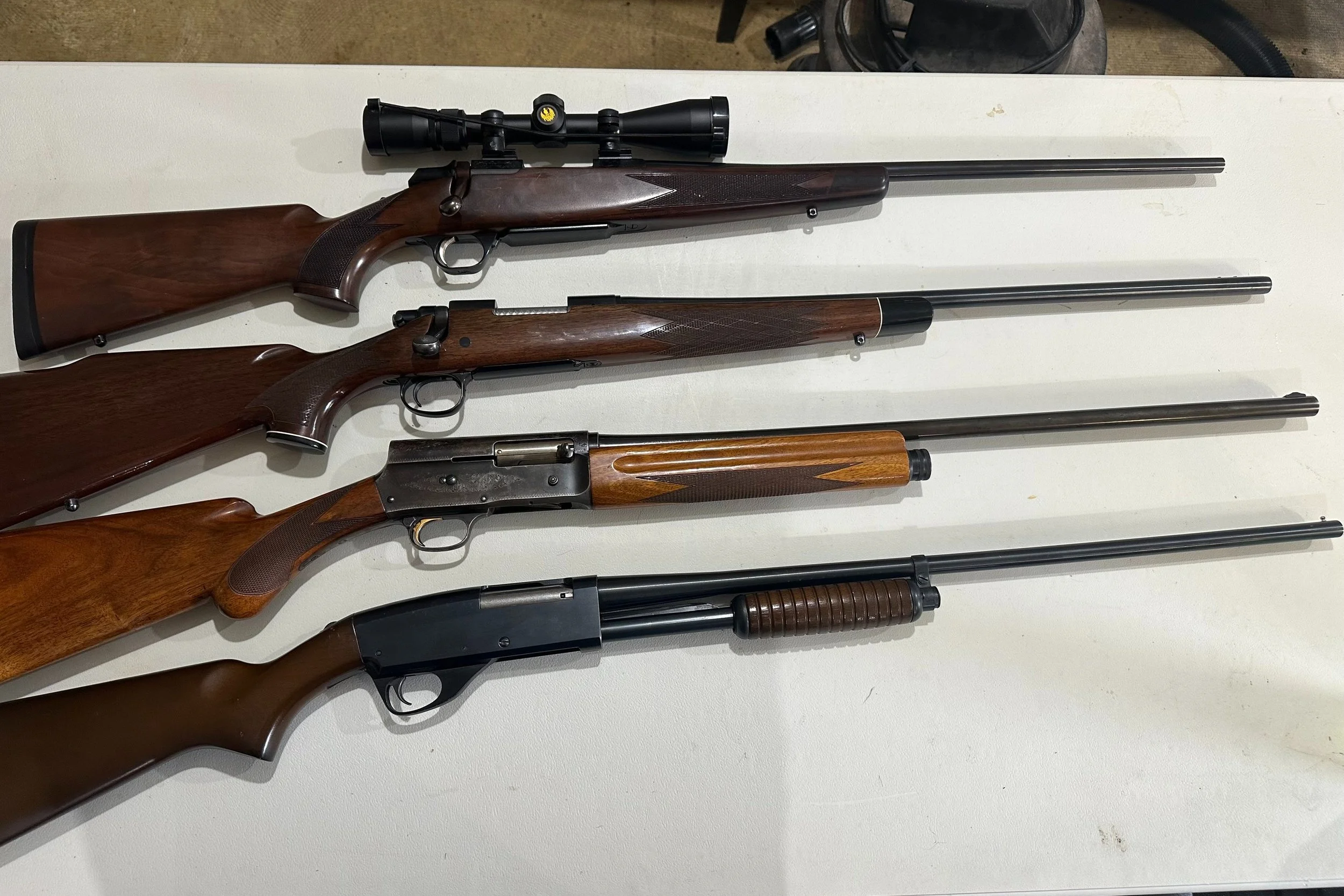 Taurus 9mm; Ruger 10/22 (.22 cal.) with scope; Winchester Model 67 (.22 bolt action); hex-barrel .32 cal. Kentucky rifle; Optima .50 cal. black-powder rifle; Russian Nagant 7.62×54R military rifle; Chinese Type 76 military rifle.