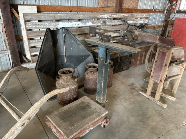 Sleigh (needs repair), sign holder, wool, scale, milking stool (unusual), cast iron ram, dinner bell, nutrena box, press, decorative clock shewes, dry sink, crocks, spool cabinet, mantle clock, numerous sheep pictures (vintage), Amana bench