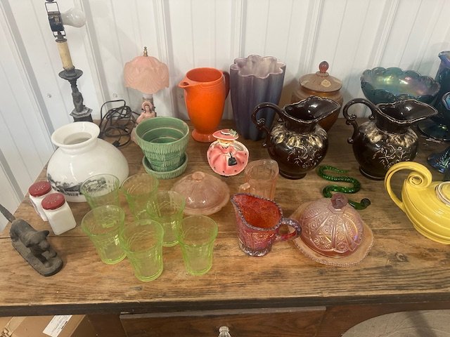 Red line Hot Wheels, Hot Wheels, vintage games, Red Devil tobacco cutter, kerosene lamps, old wooden sleds, railroad lanterns, toy tractor, marbles, Dial tobacco tin, vintage and modern Christmas decorations, steel wheels, beer light, Griswold waffle maker, Shirley Temple pitcher-plate-glass, quilts, afgans, Hager vase, multiple Treadle sewing machines, multiple crocks, pulleys, cigar boxes, old coffee tin