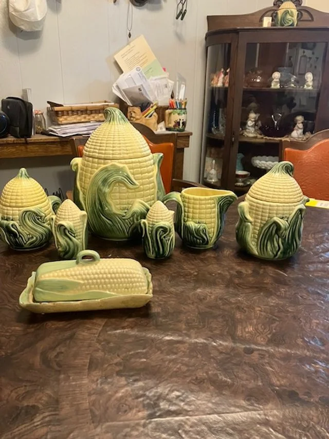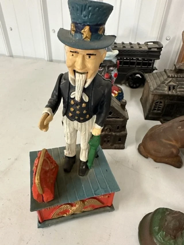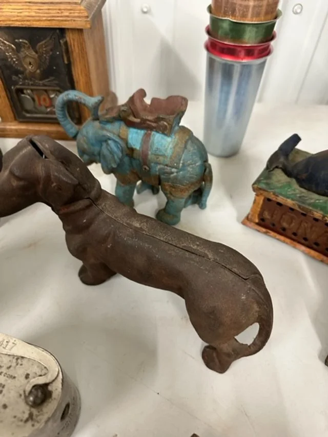 Collectables: Amber Lightning Canning Jars - Cast Iron Banks - St. Louis Crock - Parish Iowa 3gal Crock (damage handles) - Mickey Mouse Clock - Wood Duck Decoys - Marbles - Other Crockery Pieces - Metal Floor Grates - Old Rotary Telephone - Vintage Wooden Painted Signs - Coca Cola Trays - Coca Cola Tin Sign - Sinclair Oil Sign - Green Drape Aladdin Lamp - Wooden Shudders - Very nice Quilts - Vintage Children’s Clothes - Boy Scout Uniform (very early)